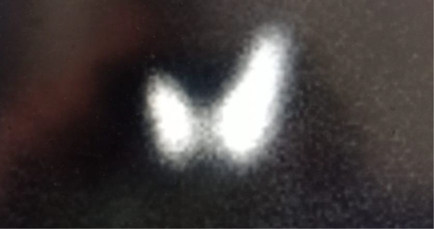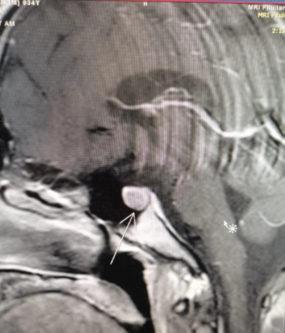 Our patient, Mr. X, a 34-year-old male, was referred to an endocrine clinic (in King Hussain Medical Center) to assess his thyroid status. Upon evaluation, he was anxious and irritated, and his sister said he had some behavioral changes for the last few months. He was usually calm and friendly, she said he lost weight despite his increased appetite. His past medical history was significant for epilepsy and minor cardiac anomalies (atrial septal defect and atrioventricular canal). During examination, he had a small firm goiter with no bruit or thrill on palpation. He also had tremors of outstretched extremities, but no opthalmopathy which can be related to thyroid disorders, galactorrhea, or acromogelic features. His heart rate was 105, and his blood pressure was 127/80. His laboratory investigations showed a thyroid function test (tft) with elevated TSH level 17 (normal range: 0.34–5.6 μU/L) and elevated free thyroxine level 2.46 (normal range: 0.7-1.8 ng/dl). We ran the test again, and it revealed similar readings. Previous thyroid function tests were normal, so a thyrotoxic condition was considered. A beta-blocker was prescribed to the patient, and it had a dramatic effect on controlling his symptoms. Ultrasonography showed a mild goiter with hypervascularity, and the thyroid scintigraphy scan showed thyroid enlargement with hypervascularity (Figure 1), so a diagnosis of hyperthyroidism was confirmed. An auto-antibody panel was sent, and it came back negative. The sex hormone binding protein was a high normal 51.97 nmol/l (range 18.3–54.1), the alpha subunit wasn't done due to unavailability. Growth hormone and prolactin were normal. In addition, pituitary magnetic resonance imaging (MRI) (Figure 2), (Figure 3), (Figure 4) was done, and it showed a microadenoma of 9.9*8.4 mm dimensions with no pressure effect on the pituitary stalk and optic chiasm. He underwent visual perimetry and his visual fields were normal. As we suspected a TSH-secreting pituitary tumor, a somatoastain analogue was given to the patient for both diagnostic and therapeutic purposes.4–7 Tsh level showed significant suppression (15 to 5 normal range: 0.34–5.6 μU/L), four weeks following the somatostatin analogue injection. As surgery is the first-line treatment for Tsh-oma, his case was discussed with the neurosurgeons, and the patient was sent for surgery. Before surgery, his heart rate was controlled by beta blockers, and then he underwent transsphenoidal surgery by an expert neurosurgeon with no significant postoperative complications.8