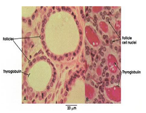 The mature thyroid gland contains numerous spherical follicles. The average diameter of the follicle is 200µm. Each follicle is lined by single row of cells called follicular cells that surround the secreted colloid. Colloid is a proteinaceous fluid that contains large amount of throglobulin (Tg), the protein precursor of thyroid hormones. Tg is a protein and thyroid hormones are obtained from Tg. When the gland is inactive the colloid is abundant, the follicles are larger the cells lining them are flat.13,14 When the gland is active, the follicles are small, the cells are cuboidal or columnar and the areas where colloid is being actively reabsorbed in to thyrocytes are visible as “resorption lacunae”. Microvilli project into the colloid from the apices of the thyroid cells and canaliculi extend into them. The endoplasmic reticulum is prominent, a feature common in most glandular cells. The Thyroid follicular cells are polarized - the basolateral surface is opposed to the blood stream and an apical surface faces the follicular lumen. Increased demand for thyroid hormone usually signaled by thyroid stimulating hormone (TSH) binding to its receptor on the basolateral surface of follicular cells, leads to Tg resorption from the follicular lumen and proteolysis within the cell to yield thyroid hormones for secretion in to the blood stream.13–15 The thyroid gland is highly vascular. The thyroid gland has a blood flow about five times the weight of the gland each minute. It receives both sympathetic and parasympathetic nerve supply. Sympathetic nerves control the blood supply of the thyroid gland (Figure 1).14