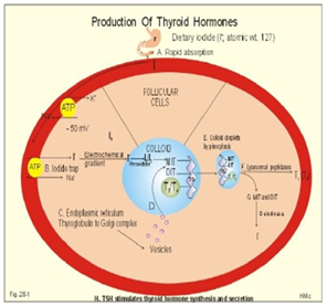 Iodide trapping (Iodide pump): Food iodide from the blood is taken up by the follicular cells of thyroid-a process called iodide trapping. Iodide trapping occurs against electrochemical gradient because the interior of the follicular cells is –ve and iodide ion is also –ve. The iodide concentration of follicular cells is 30 times higher than in the blood hence, iodide trapping is a active process requires the activity of Na+K+ATPase. When the thyroid gland becomes maximally active, this concentration ratio can rise to as high as 250 times.14–16 The rate of iodide trapping is influenced by several factors, the most important being the concentration of TSH; TSH stimulates and hypophysectomy greatly diminishes the activity of iodide pump in thyroid cells.16