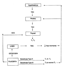 Figure 4 Schematic Representation of the Physiologic Adaptation to Pregnancy, showing increased Thyroxine Binding Globulin (Tbg) Concentrations, Increasedhuman Chorionic Gonadotropin (Hcg) with its Thyrotropin-like activity, Andalterations in Peripheral Metabolism of Thyroid Hormones in Theplacenta.
