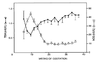 HCG has intrinsic thyrotropic activity. It increases shortly after conception, peaks around gestational age week 10, declines to a nadir by week 20.20 It directly activates TSH receptor. Transient decrease in TSH between 8-14wks mirrors the peak HCG concentration. In 20% of normal women TSH level decreases to less than lower limit of normal. During the first trimester of pregnancy, when hCG is at its greatest concentration, serum TSH concentrations drop, creating the inverse image of hCG. In most pregnancies, this decrease in TSH remains within the health-related reference interval.22 Under pathological conditions in which hCG concentrations are markedly increased for extended periods, significant hCG-induced thyroid stimulation can occur, decreasing TSH and increasing free hormone concentrations. Members of the glycoprotein hormone family of luteinizing hormone, follicle-stimulating hormone, TSH, and hCG contain a common α-subunit and a hormone-specific β-subunit. Because the hCG and TSH β-subunits share 85% sequence homology in the first 114 amino acids and contain 12 cysteine residues at highly conserved positions, it is likely that their tertiary structures are very similar.27,28 Purified hCG, like TSH, has been shown to: