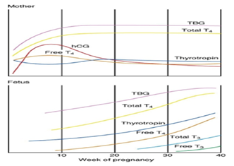 Maternal T4 has been demonstrated in coelomic fluid at 6 weeks and in the fetal brain by 8 weeks gestation supporting the important role of maternal thyroid harmone during first trimester of pregnancy for fetal brain development. Several studies suggested that mild maternal thyroid harmone deficiency in the first trimiser could result in long-term neurophysiological damage to the offspring. Despite these acute changes in total harmone concentration, the serum free fraction of both T3 and T4 remains within normal limits, unless there is decreased supply of iodine to the mother or in the presence of abnormalities of thyroid gland. Goiter is commonly seen in pregnancies in areas with iodine deficieny, however in the United States and other areas of the world with sufficient iodine intake, the thyroid gland doesn’t clinically increase in size during pregnancy. Therefore, the detection of a goiter in pregnancy is an abnormal finding that needs careful evaluation. The most common cause of diffuse goiter is chronic auto immune thyroiditis or Hashimoto thyroiditis. Most patients are euthyroid, and his diagnosis is made by the determination of thyroid antibodies, mainly thyroid peroxidase (TPO). Antibody concentration decreases in pregnancy and increases in post partum period. Higher values in first trimester of pregnancy are predictors of syndrome of post partum thyroid dysfunction. In pregnancy, fetus receives iodine from maternal source in all the trimisters. Fetus receives thyroxine from mother up to 12 weeks through placental circulation but not TSH or ft3. Thyroid gland is the first of the endocrine gland to develop, on approximately 24th day of gestatation. Thyroxine is partially converted to ft3 and combines with receptors in fetal brain and responsible for fetal brain development. From 12th week, placental changes resist T4 passage to fetus and fetal pitutary thyroid axis starts functioning like adult.