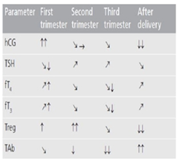 →: No change; _: Slight decrease; ↓: Decrease; ↓↓: Marked decrease; _: Slight increase; ↑: Increase; ↑↑: Marked increase when compared with the previous period. fT3: Free triiodothyronine; fT4: Free thyroxine; hCG: Human chorionic gonadotropin; TAb: Thyroid autoantibodies; TSH: Thyroid stimulating hormone.