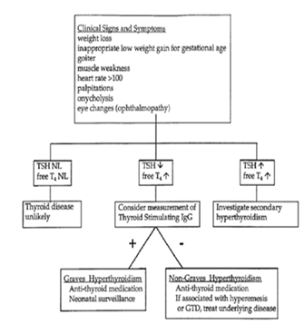 Incidence of Hyperthyroidism is 0.2%.28 Subclinical hyperthyroidism is defined as serum TSH concentration below the lower limit of reference range, with fT3 & fT4 concentration within normal range.28 Overt hyperthyroidism is defined as serum TSH concentration below the lower limit of reference range, with increase in fT3 & fT4 concentration.28 Gestational transient hyperthyroidism is associated with hyperemesis gravidarum commonly presenting with elevated levels of fT4 and suppressed levels of TSH.28 This change is associated with β-HCG stimulation of thyroid gland. Fetus of hyperthyroid mother is at risk because; TSH receptor stimulating autoantibodies are the culprits of pathogenesis in the fetus. The likelihood of developing fetal hyperthyroidism requiring treatment is related to the level of maternal stimulated TRAb levels, medical treatment of maternal disease. It crosses the placenta and stimulates the fetal thyroid.