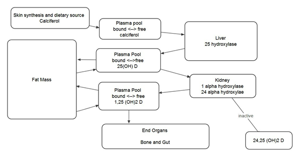 All clinical sampling is all done from the plasma pool, which consists of both free and bound metabolite, of which only the free form is biologically important. This is the result of transfer out of the hepatic 25(OH)D or the renal 1,25(OH)2D pools as well as transfer in and out of the fat mass. Additionally, the influence of the regulatory elements on the transfer coefficients are not quantitatively known, nor is the amount of metabolite in those pools sampled directly and, as a result, no real assessment of the amount of 25(OH)D, nor of the transfer coefficients in or out of the pools, nor the efficiency of transformation from calciferol to 25(OH)D within the liver can be implied or assessed. Finally, not included in the scale of this diagram is the size of the fat mass or the stores of the fat soluble metabolites in the fat mass. The number of variables and degree of uncertainty is the major reason that one cannot consider any single intermediate element, such as the total serum 25(OH)D concentrations, as a viable estimate of the overall vitamin D status.
