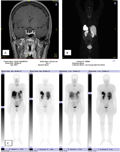 A pituitary MRI revealed a partially empty sella, with no evidence of pituitary adenoma (Figure 1) In order to exclude an ectopic source of the GH hypersecretion, further imaging (CT CAP, octreotide scan) tests were performed, all were normal. Whole-body 68 Gallium DOTATATE PET/CT revealed normal uptake in the pituitary and body (Figure 1). Thyroid US showed, two nodules the left lobe, measuring 2 cm (TR3 & TR4) with benign cytology. She refused to do colonoscopy. As clinical context of acromegaly with an empty sella, patient has been commenced on 20 mg monthly octreotide acetate. After receiving 4 doses of octreotide, her IGF-1 & GH has reduced (Table 1,2) (Figure-1).