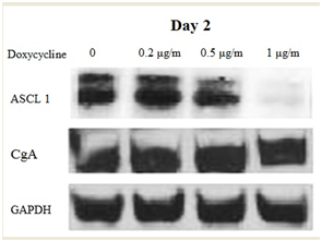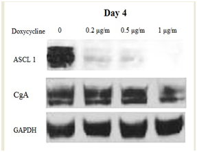 When using inducible cell models, it is important to make sure that the model present truly induced cells and to understand the pattern on the inducement. In order to test the effect of induction, TT-MEK cells were treated with and without doxycycline (0.2, 0.5 and 1µg/ml) up to 4 days. Every 2 days, cell extracts were prepared and analyzed for phosphor ERK, CgA, and ASCL1 protein levels. As shown in Figure 2, phosphor ERK protein was detectable only in the presence of doxycycline, and the induction stayed stable over the 4 days. Cell lysates from TT-MEK cells treated with varying levels of doxycycline (0-1µg/ml) over 2 and 4 days were analyzed for changes in NET marker production. We have shown that an increase in phosphor ERK protein leads to dose-dependent reduction in expression of both ASCL1 & CgA. The reduction is more with four days of treatment (Figure 3A) (Figure 3B).