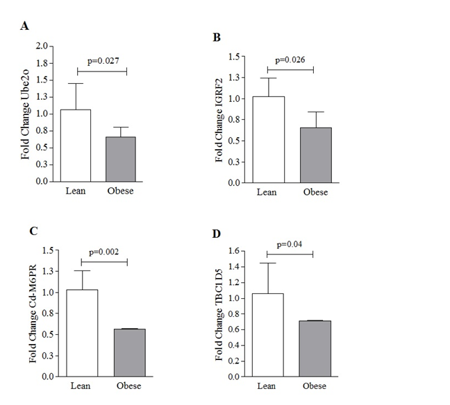 Figure 2 Determination of Ube2o, Igfr2, Cdm6pr and Tbc1d5 mRNA levels in the arcuate nucleus by qPCR. Twelve-week-old C57BL/6Junib male mice were randomly assigned to a standard (St) (n=6) or high-fat diet (n=6). Gene expression data were determined by qPCR on the 8th week and represented as fold change relative quantitation. Values were expressed in means ± SD. Comparisons between groups were evaluated by one-way analysis of variance, followed by the Student T-test. p<0.05 was considered significant. For both groups, n=6.