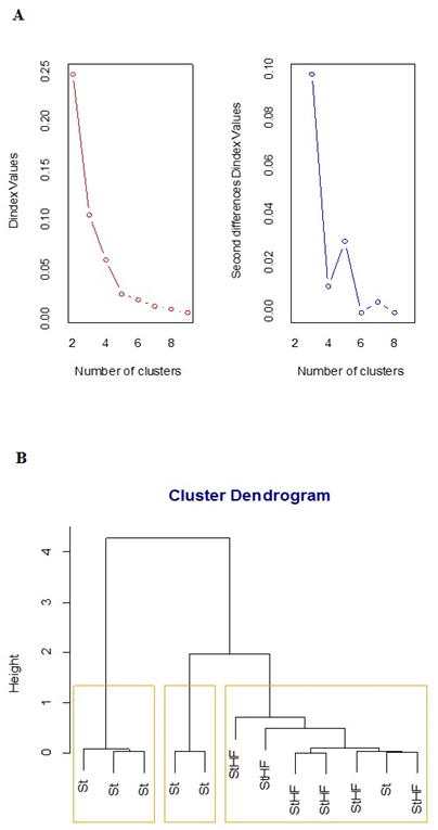 Figure 3 Hierarchical Clustering for St and StHF feed mice by Ward’s method. Twelve-week-old C57BL/6Junib male mice were randomly assigned to a standard (St) (n=6) or high-fat diet (StHF; n=6). Fold change values were determined by qPCR on the 8th week. Euclidean distance was used as metric with UBE2O, IGFR2, CDM6PR and TBC1D5 fold change values as dimensions (clustering dendrogram). The number of clusters was obtained by D Index.