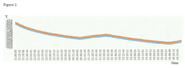Preliminary thermostats tests of each sensor, as well as their coupling, at different temperature levels, provided several times at 2month intervals have shown a resolution of 1byte (0.0625°C), a precision of 0.1°C, a good reproducibility and a maximal derive between sensors registered values of 0.19bytes, that may be considered as not significant (Figure 2).