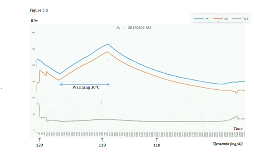 Figure 3D&E Example and graphic of the influence of warming by a lamp: quick elevation of temperatures and DT, glycaemia slightly diminishing or stable.