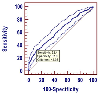 rs1801282 of PPARγ2 gene and rs4994 of ADRβ3 gene allelic combinations yielded four allelic types [Allelic type-1: PPARγ2ref+ADRβ3ref (Pro/Pro+Trp/Trp); Allelic type-2: PPARγ2ref+ADRβ3va (Pro/Pro+Trp/Arg); Allelic type-3: PPARγ2va+ADRβ3ref (Pro/Ala+Trp/Trp); Allelic type-4: PPARγ2va+ADRβ3va (Pro/Ala+Trp/Arg)]. For assessment of interactions, we dichotomized biochemical parameters viz. HbA1c, HOMA-IR into normal/high and lipid status into dyslipidemia/non-dyslipidemia [HbA1c≥7.0% in T2DM and HbA1c≥5.7% in controls was regarded as high in accordance with IDF recommendations].22The cut-off of HOMA-IR (3.95) was determined on ROC analysis [specificity: 87.8% (95% CI: 84.7-90.4%); sensitivity: 32.45% (95% CI: 28.3-36.8); +LR: 2.66 (95% CI: 2.1-3.4); -LR: 0.77 (95% CI: 0.7-0.8); +PV: 77.7%; -PV 58.9%; Supplementary Figure 1].