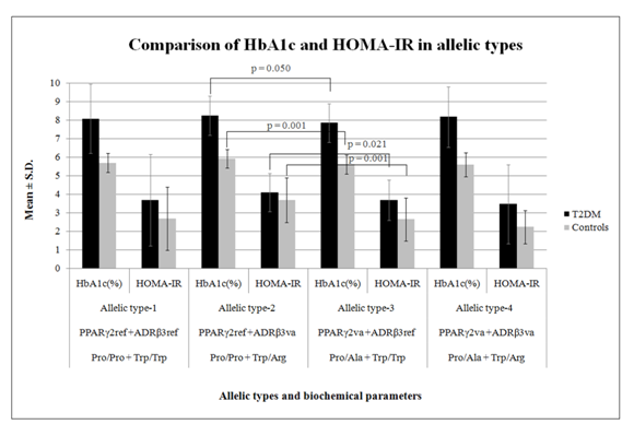 We compared the Mean±SD of HbA1c and HOMA-IR with aforementioned four allelic combinations. A higher HbA1c and HOMA-IR was seen in allelic combination-2 as compared to combination-3 (HbA1c: T2DM p=0.050, Controls p=0.001) and (HOMA-IR: T2DM p=0.021, Controls p=0.001); Figure 2] suggesting a likelihood of association of PPARγ2ref and ADRβ3va alleles with poor glycation and insulin resistance in our study population.