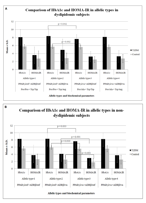 When presence or absence of dyslipidemia was added to these allelic combinations, allelic type-2 bearing T2DM individuals but not control individuals had higher HbA1c (p=0.042) and HOMA-IR (p=0.002) than allelic type-3 (Figure 3A & B). Similarly, non-dyslipidemic individuals with allelic type-2 also demonstrated higher HbA1c (T2DM p=0.033; Controls p=0.001) and HOMA-IR (T2DM p=0.010; Controls p=0.001) than individuals (both diabetics and controls) with allelic type-3 again suggesting a likelihood of association of reference allele of PPARγ2 gene and variant allele of ADRβ3 gene to poor glycation and insulin resistance.
