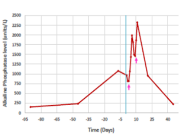 Secondly, the patient received filgrastim, a recombinant granulocyte colony stimulating which stimulates the production and activity of neutrophils. In the initial studies on clinical toxicity, a twofold rise in ALP and a 2.5-fold increase with normal GGT levels was reported. These changes were thought to result from myelogenous progenitor expansion within the bone marrow.9 Similarly, in a dose-escalation study of filgrastim versus placebo in patients with severe active rheumatoid arthritis, an increase in median ALP from baseline to day 5 was observed following administration.10 Additionally, in a breast cancer study, 506 patients were randomized to chemotherapy with or without filgastrim at different doses. They found that serum levels of ALP were significantly higher in patients receiving filgrastim than those who did not (p=0.0001).11 Differentiation of ALP isoenzyme was not reported, however, there was no clinical or laboratory evidence of liver dysfunction, significant difference on transaminase levels or GGT elevation between both groups. Of note, ALP elevation resolved within 3 weeks.