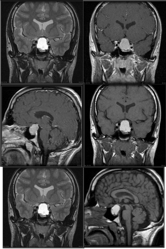 A well-circumscribed mass is present within the expanded sellaturcica. This mass has suprasellar extension and demonstrates iso-intense signal on T1 weighted imaging, heterogeneous but predominantly low signal on T2 weighted imaging, and has predominantly peripheral enhancement, the lesion mildly bulges into the right cavernous sinus with no definite invasion. The optic chiasm is superiorly displaced by the mass and drapes over it. The lesion elevates anterior aspect of floor of the third ventricle without causing hydrocephalus.