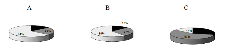 Sixty four percent of the patients with A1C < 5.7% had a normal OGTT result, but 14.3% of them had levels of 2-hPG >11.1 mmol/L. The group of patients with A1C between 5.7-6.4% had similar results of OGTT when compared to the group of A1C < 5.7%. Levels of A1C ≥ 6.5% were related to alterations in the OGTT on 85.7% of the cases, but only 28.6% of the patients had 2-hPG >11.1 mmol/L. On the other hand, only 31.6% of the patients with diagnosis of diabetes by the OGTT had A1C levels ≥ 6.5% (Figure 1).