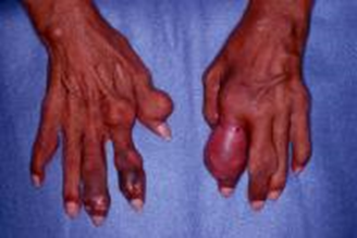 A 55-year-old Male, (South Pacific, descendant) had been admitted on December 17th, 2006, to medical unit, for being unable to walk for the last 2 days. He had found difficulty in moving his right arm with pain and swelling of the left and right foot, right hand, and elbow. Pain and swelling were associated with fever and malaise.