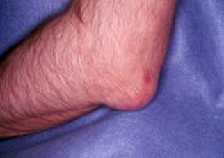 Figure 2 Left elbow had swelling, redness, tenderness, and restriction of movements. Right Elbow had big tophi, soft, rubbery with overlying chalky cheesy material.