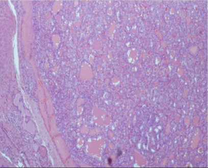 Figure 2 The largest tumor was partially encapsulated and showed follicular pattern, with conventional papillary carcinoma cytology.