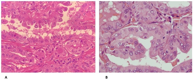 In the literature, the simultaneous appearance of different histological variants of thyroid cancer in the same patient has been reported, with different presentations, among the most common the concomitant appearance of MTC and PTC, PTC with dedifferentiation to anaplastic carcinoma (ATC), PTC with fasciitis-like stroma, and PTC with PTC, the latter being an unusual event that is rarely reported.2 In this article we present a clinical cases of patient with simultaneous appearance of different thyroid cancer subtypes (Figure 1).