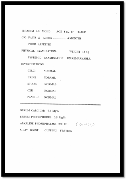 - On Admission march.12.89, he was given the diagnosis of Refractory Rickets!