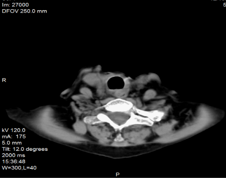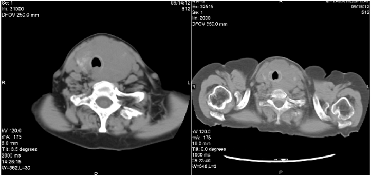 The patient underwent imaging of the neck for further evaluation. CT demonstrated marked enlargement of the thyroid gland, left greater than right. There was mass effect on the trachea, decreased diameter of the trachea and enlarged neck nodes (Figure 1). The patient underwent total thyroidectomy.