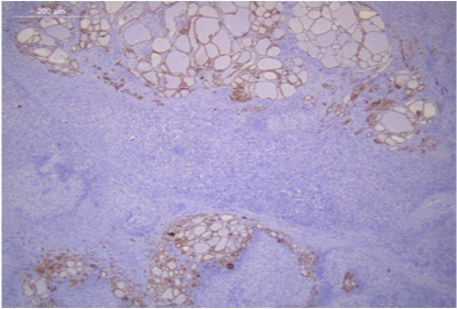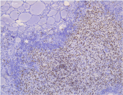 Combined histological and immune histological analyses led to the diagnosis of la diffuse large B-cell lymphoma of the follicular centre/ activated like-cell-non GCC, with a high proliferation index (Mib1/Ki-67 : 90%) , positive LCA(CD45Rb), CD10, CD75, CD79a, BSAP, BCL6, BCL2, MUM1, k-light chain, p53 and p63 and negative reaction of the neoplastic cells for CKAE1-3, EMA, HBME1,Thyreogloboulin, Galectin-3 and others (Figure 2).4