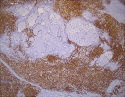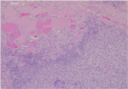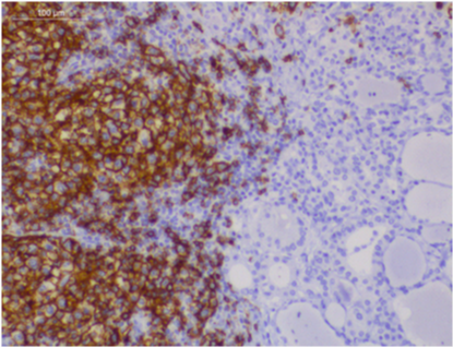 We describe an unusual case of a PTL. Within the population, this disease is estimated to occur at an annual incidence rate of 2.1 persons per million. PTL is associated with a poor prognosis.5 Most thyroid lymphomas are of B-cell origin. Mucosa associated lymphoid tissue (MALT) is recognized as a distinct lymphoma with unique clinopathological features and follicular lymphoma is another very rare subtype.