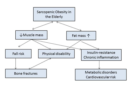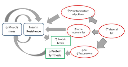 Footnote to Figure 1 The loss of muscle mass associated with age contributes to the development of insulin resistance which in turn aggravates the loss of skeletal muscle. In addition, an increase of vsiceral fat in the obese, elderly patient is associated with a production of proinflammatory adipokines that have a positive association with fat mass. Insulin resistance and systemic inflammation stimulate protein breakdown and suppression of muscle synthesis. Obese sarcopenic patients have greater insulin resistance than only obese or only sarcopenic patients.