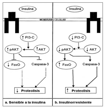 Insulin regulates the amount of skeletal muscle tissue by inducing changes in protein degradation.37 Under normal conditions (Figure 2a) the binding of insulin to its receptor activates the phosphatidylinositol 3-kinase (PI3K) protein and the serine threonine kinase (AKT) protein. Activation of the AKT protein leads to a decrease in proteolytic activity mediated by the suppression of caspase-3 activity and FoxO (Forkhead box O) protein. In insulin-resistance states (Figure 2b) PI3-kinase and AKT activity is reduced, resulting in an increase of proteolytic activity and a reduction in lean mass.37