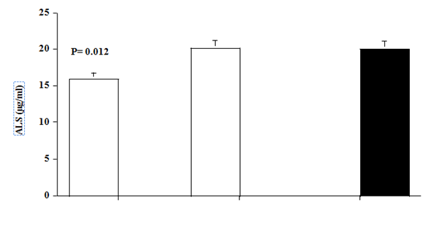 Untreated hyperthyroid patients had significantly lower ALS concentrations than normal control subjects (patients vs. controls, 15.9±1.5 vs. 20.0±0.7 μg/ml, p=0.012). Levels of ALS increased significantly, after 6 months therapy with antithyroid drugs, to levels (20.1±1.8 μg/ml, p=0.006, compared with pre-treatment level) similar to those of control subjects (Figure 1).