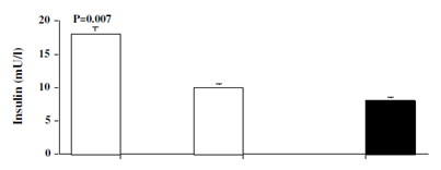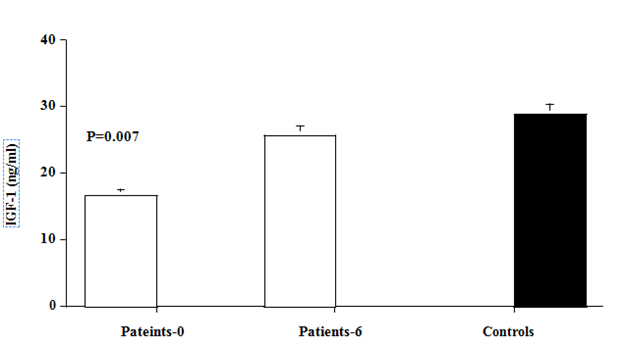 Pre-treatment levels of IGF-1 were significantly lower in hyperthyroid patients compared with normal control subjects (16.7±2.4 vs. 28.9±2.3ng/ml, p=0.007). Levels of IGf-1 increased significantly, after 6 months therapy with antithyroid drugs to levels (25.8±4.2ng/ml, p=0.046, compared with pre-treatment level) similar to those of control subjects (Figure 1).