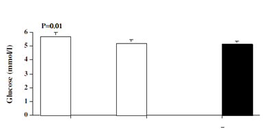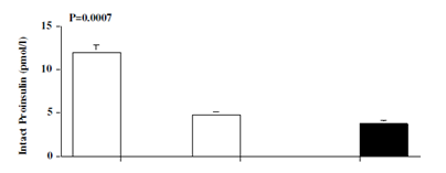 Pretreatment fasting glucose (p=0.01), insulin (p=0.007), intact proinsulin (p=0.02) were significantly higher in patients than controls. Patients tended to be more insulin insensitive compared with controls as shown by the calculated HOMA insulin resistance (p=0.07). After 6 months of antithyroid therapy with attainment of euthyroidism, concentrations of fasting glucose, insulin, intact proinsulin and HOMA insulin resistance decreased significantly in the patients and became similar to those of controls (Figure 2).