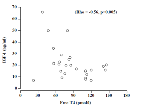 Within the patients, levels of ALS (Rho= -0.36, p=0.049) and IGF-1 (Rho= -0.66, p=0.001) demonstrated significant negative correlations with free T3. However, only IGF-1 concentration demonstrated a significant negative correlation with free T4 (Rho= -0.56, p=0.005). ALS and IGF-1 were not associated with TSH, nor with age, BMI, fasting glucose, insulin, intact proinsulin, or with IR (Figure 3).