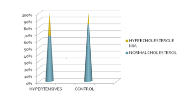 Further analysis showed that of the 18 subjects (25.35% of the population studied) in the study with hypercholesterolemia (both control and hypertensives) 66.6% (12 subjects) have hypertension while 33.3% (6) were normotensive which translate that 2 out of every 3 with hypercholesterolemia had hypertension.
