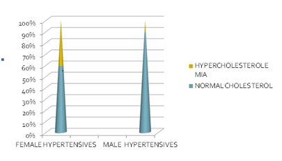 Genderwise, hypercholesterolemia was commoner among hypertensives that are female, 40.74% (11 females) of the hypertensive female population compared to 11.1% among hypertensive male population see Figure 2.