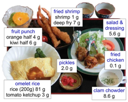 One of the common educational handouts for seminar is shown in Figure 1. The important points were as follows: i) rice and fruits have much carbohydrates, ii) some dressings include moderate carbohydrate, iii) there are differences between fried chicken (0.1g) and deep-fried food (7g), iv) this meal has totally 118g of carbohydrate more than supposed. The subjects who want to continue LCD have to know the carbohydrate amount included in any kind of food.22
