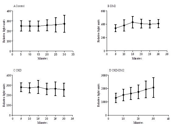 Figure 2 Typical curve of kinetic study of unstimulated reactive oxygen species production by granulocytes from Control group (A), Type 2 diabetes mellitus patients (B), chronic kidney disease (C) and chronic kidney disease with type 2 diabetes mellitus (D). Values expressed as mean±standard error.