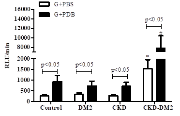 Figure 3 Production of reactive oxygen species in PDB-stimulated granulocytes (G) from controls, type 2 diabetes mellitus patients (DM2), chronic kidney disease patients (CKD) and chronic kidney disease patients with type 2 diabetes mellitus (CKD-DM2).