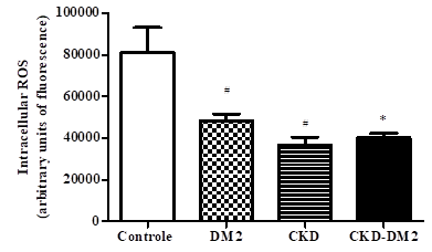 Values expressed as mean±standard error. #p<0.05 vs Control; *p<0.05 vs DM2. Analysis determined by Student´s t test. DM2, type 2 diabetes mellitus; CKD, chronic kidney disease; CKD-DM2, chronic kidney disease with Type 2 diabetes mellitus patients. n, = 20 for each group.