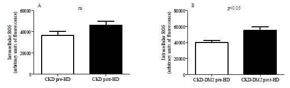 Figure 5 Intracellular reactive oxygen species (ROS) production pre and post hemodialysis (HD) in CKD patients in the absence (A) and presence (B) of type 2 diabetes.