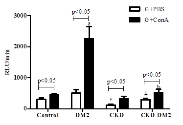Figure 6 Production of reactive oxygen species in Concanavalin A (ConA)-stimulated granulocytes (G) from controls, type 2 diabetic patients (DM2), chronic kidney disease patients (CKD) and chronic kidney disease patients with type 2 diabetes (CKD-DM2).