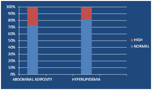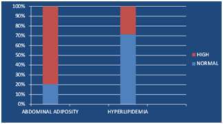 A marked disparity was noticed between gender with respect to those with hyperlipidemia and high abdominal adiposity. In male subjects with hyperlipidemia the subject with high abdominal adiposity is in the minority (25%) while in the female subjects with hyperlipidemia, those with high abdominal adiposity are in the majority (78.57%). The disparity here is marked and of significant prognostic importance.