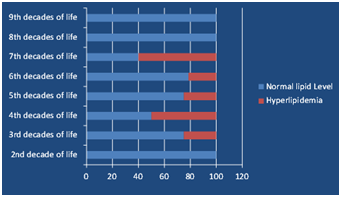 In the female gender, the age range of the studied female population is 18-88years with a mean age of 46.29years. Of these 20.41% (10) had normal abdominal adiposity while 79.59% (39) had high abdominal adiposity (Figure 2). Also 28,57% (14) had hyperlipidaemia while the remaining 71.43% had normal plasma lipid level (Figure 4).The distribution of hyperlipidaemia against decades of life in female shows none in the 2nd decade of life,25% (2) in 3rd decade of life, 50% (3) in 4th decade of life, 25% (3) in the 5th decades of life, 21.43% (3) in the 6th decades of life, 60% (3) in the 7th decades of life and none in the 8th and 9th decades of life in this study (Figure 5). Of the female subjects with hyperlipidaemia,78.57% (11) had high abdominal adiposity while 21.43% (3) had normal abdominal adiposity (Figure 2). While female subjects with both hyperlipidaemia and high abdominal adiposity span through the 3rd to 7th decade of life, the three female subjects with hyperlipidaemia and normal abdominal adiposity are one in 4th decades of life, and one each in 6th and 7th decades of life. However, among those with high abdominal adiposity in the female gender, only 28.21% (11) had hyperlipidaemia, the remaining 71.79% had normal fasting cholesterol level despite having high abdominal adiposity (Figure 3).