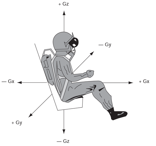 Any change in the speed vector applied to a body induces acceleration and an inertial force in the opposite direction of the acceleration. In aeronautical operations + Gz accelerations are the most frequent in aviation mainly in fighter aviation, they are radial accelerations applied on the large vessels axis, causing an inertia force directed from the head to the feet (Figure 1). They will increase the gravitationnal component of blood pressure (BP) according to their intensity factor.9 hydrodynamics disorder resulted from blood maldistribution to the lower part of the body by G load, can produce reduced venous return from the lower half of the body and also reduced blood circulation around central nervous system (CNS ) in the cranial cavity.
