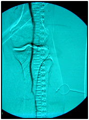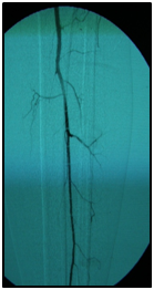 Endovascular procedure was done with antegrade access in the ipsilateral common femoral artery, diagnostic angiography confirmed: Patency of the femoral-popliteal axis, occlusion of the posterior and anterior tibial arteries, two critical stenotic lesions in the fibular artery and revascularization of the dorsalis pedis and plantar arteries by the fibular artery. To treat the fibular critical atherosclerotic lesions were performed a percutaneous transluminal angioplasty using a 0.0018in.guidewire, catheter support and a catheter balloon (3,0x6 mm and 3,5x 15mm).