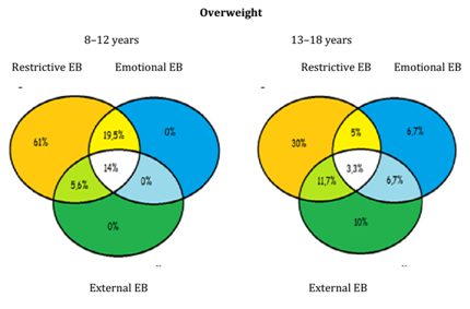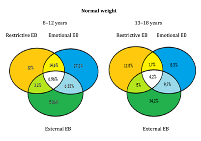 In children group 8-12years with normal weight were more often present combined EB (31.1%), with a predominance of a combination of restrictive and emotional types of EB (14.6%), in comparison with the adolescents group (20.1%), which was dominated by a combination of emotional and external types of EB (9.2%) (Figure 2).