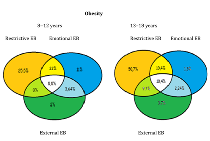 Our results showed that for children age group 8-12years with overweight and obesity had a restrictive type of EB, that are comparable to studies in Europe and Chile in children in this age group.16,21-23 However, in study in children of this age with overweight/obesity is not obtained correlation restrictive type of EB and BMI, as in a number of works of foreign researches,16,21,24 but obtained a negative correlation between external type EB and BMI, which is consistent with their results.21,23 In children with overweight/obesity in the age group of 8-12years obtained a higher proportion of children with emotional type of EB than in previously conducted studies.14,16,23