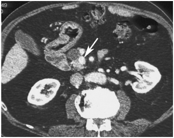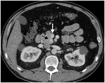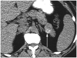 CT scan has many advantages since it can be easily performed, is non-invasive and the images are easily interpretable for the surgeon. Insulinoma typically appear as well-defined, rounded, homogeneously masses of the pancreas. Because the majority of insulinoma are usually smaller than 2cm, dynamic CT scan should be performed; the sensitivity of the dynamic CT scan in the detection of insulinoma ranges from 30% to 66%. Dual-phase contrast spiral CT scan is more sensitive than other noninvasive imaging studies. In a group of seven patients with tumors that were biochemically proven but not previously located by ultrasonography, CT scan, or magnetic resonance imaging, six of seven tumors ranging from 6 to 18 mm were detected by dual-phase spiral CT scan. Atypical CT scan imaging of insulinoma includes hypoattenuating masses on enhanced CT or intra-arterial dynamic CT, cystic masses, and calcified masses (Figure 1–3).26–30